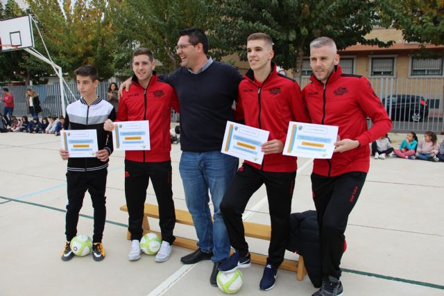 Además, Miguelín, Fernando y Alberto le han hecho entrega al director del colegio, Francisco de la Cruz y al profesor de Educación Física, Fulgencio Marín de una camiseta del equipo firmada por la plantilla y el libro 'ElPozo, 25 años de sueños'. Asimismo, el colegio les hizo entrega de un diploma en agradecimiento por la visita.