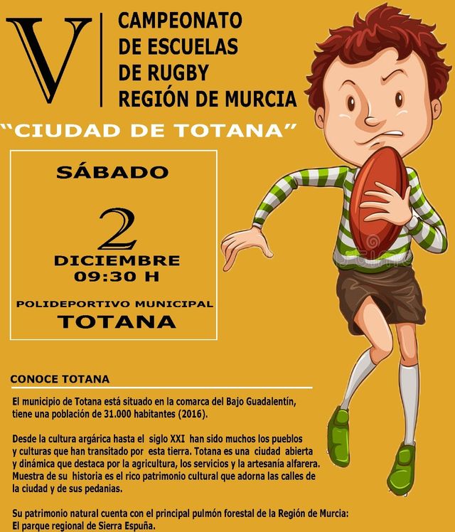 El V Campeonato de Escuelas de Rugby "Ciudad de Totana" se celebra este sábado 2 de diciembre, en el Polideportivo Municipal "6 de Diciembre", con la participación de más de 200 deportistas de diez escuelas, dentro del programa de actividades deportivas del programa de fiestas de Santa Eulalia.