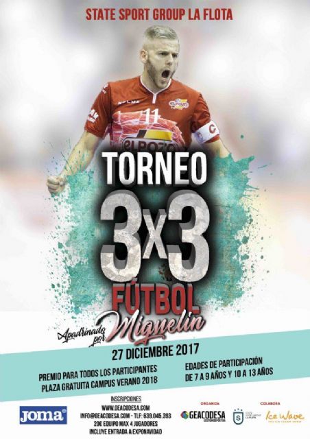 El próximo 27 de Diciembre se desarrolla el I Torneo de fútbol 3x3 MIGUELÍN, dirigido a grupos de 4 jugadores máximo y sólo 20 Euros por equipo. Este torneo está integrado dentro de la programación de Exponavidad que se desarrolla en el centro State La Flota de Murcia.