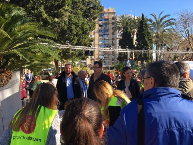 El alcalde de Murcia, José Ballesta, acompañado del concejal de Modernización de la Administración, Calidad Urbana y participación, José Guillén, y la concejala de Derechos Sociales, Conchita Ruiz, y el concejal de Deportes y Salud, Felipe Coello, han visitado esta mañana el taller de adornos navideños que Proyecto Abraham está realizando en el Gran Árbol de Navidad de la Plaza Circular.