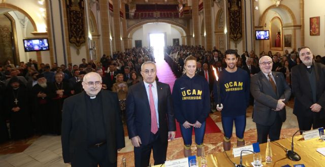 Diplomáticos y estudiantes internacionales de la Universidad Católica de Murcia han participado en un acto de lectura de mensajes y encendido de la 'Antorcha por la Paz', portada por los olímpicos Jennifer Pareja y Miguel Ángel López desde el Monasterio de Los Jerónimos hasta Capuchinos, donde esta noche se celebrará un encuentro ecuménico