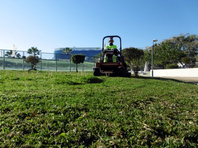 Distintos equipos están realizando labores de siega del césped en los más de 500 jardines con que cuenta el municipio de Murcia, actuando en casi 700.000 metros cuadrados.