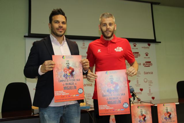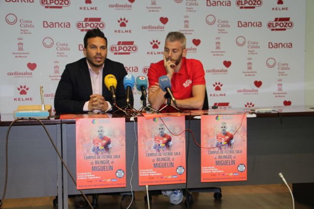 El capitán e internacional de ElPozo Murcia FS, Miguel Sayago Martí 'Miguelín, junto al gerente de Geocadesa gestión deportiva, Antonio Legido, presentaron la SEXTA edición del Campus de Fútbol Sala Bilingüe Miguelín y que se desarrollará en la localidad del Mar Menor de Los Alcázares del 8 al 14 de Julio. Dirigido a niños y niñas desde 6 años a jóvenes de 18 años.