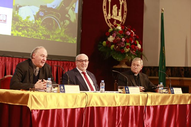 'La fragilidad nos hace fuertes' es el lema elegido para la celebración del Congreso Internacional de Cuidados Paliativos que acoge hoy y mañana jueves la Universidad Católica de Murcia, organizado junto al Pontificio Instituto Teológico Juan Pablo II y la Pontificia Academia para la Vida. Los actos se han desarrollado en el Templo del Monasterio de Los Jerónimos, repleto de estudiantes y asistentes relacionados con el área de la salud y el cuidado de las personas. En la inauguración han intervenido José Luis Mendoza, presidente de la UCAM; José Manuel Lorca Planes, obispo de la Diócesis de Cartagena, y monseñor Renzo Pegoraro, canciller de la Pontificia Academia para la Vida, quien ha impartido la conferencia inaugural 'Fragilidad y muerte en la doctrina de la Iglesia'.