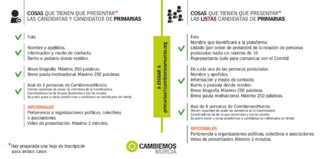 Cambiemos Murcia arranca mañana el proceso de primarias del que saldrán los candidatos y candidatas que representarán a la formación municipalista en las elecciones municipales del próximo 26 de mayo.