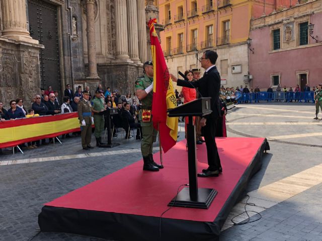 El alcalde de Murcia, José Ballesta, hizo hoy entrega de la enseña nacional al Regimiento de Infantería ‘Zaragoza' nº 5 de paracaidistas en la plaza Belluga, donde tuvo lugar una parada militar con motivo de la distinción concedida a esta unidad creada en 2016 y con sede en el acuartelamiento Santa Bárbara, ubicado en la pedanía murciana de Javalí Nuevo.