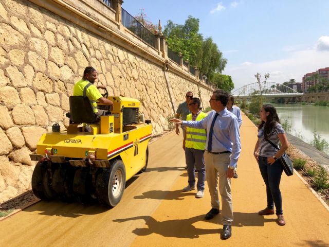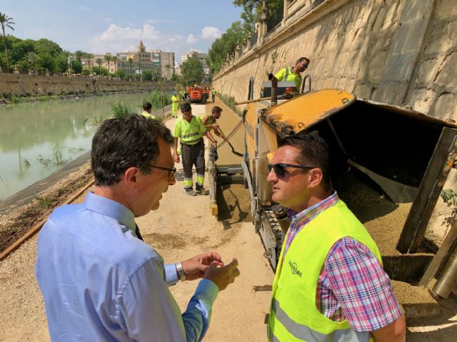El alcalde de Murcia, José Ballesta, ha visitado los trabajos que se están ejecutando en la margen izquierda de ‘Murcia Río’, un nuevo espacio naturalizado que se abrirá a todos los murcianos el próximo jueves, día 5 de septiembre, y que contará con un carril bici y un paseo peatonal en espacios diferenciados, gracias al nuevo pavimento naturalizado en dos tonalidades, que se está instalando.