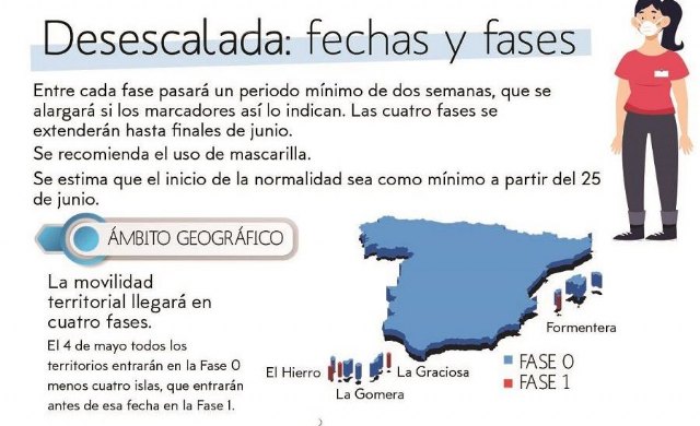 La movilidad territorial llegará en cuatro fases. El próximo lunes, 4 de mayo, todos los territorios entrarán en la Fase 0 menos cuatro islas, que empezarán antes de esa fecha en la Fase 1, que son: El Hierro, La Gomera, La Graciosa y Formentera.