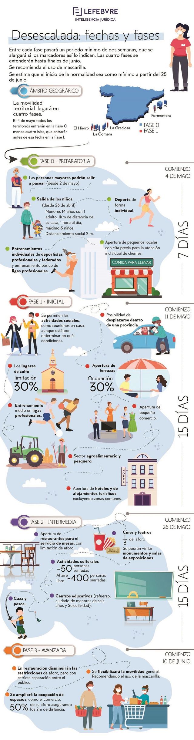Muchas han sido las dudas que se han generado respecto a la duración de este plan, cuáles son las fases y en qué consiste cada una de ellas. Tal como comunicaba el Gobierno, las fechas concretas y la evolución real dependerán del comportamiento y el control de la pandemia del COVID-19. Por ello, Lefebvre, empresa líder en España en información jurídica y práctica para el abogado, ha elaborado una infografía que resume toda la información y cronología de los pasos a seguir a partir del próximo 4 de mayo: