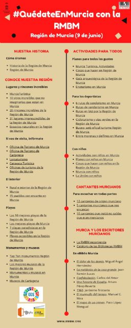 De esta manera, se ofrecen recomendaciones literarias, enlaces web para conocer la Región, un recorrido por la historia y rincones singulares, planes para hacer en familia y para deportistas, así como una selección de lecturas sobre cantantes y escritores murcianos, entre otros recursos.