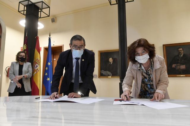 José Luján, rector de la Universidad de Murcia, y Josefina Lozano Carbonell, presidenta de la Asociación Colabora Mujer, han sido los encargados de firmar el acuerdo en un acto celebrado en la Convalecencia, sede del Rectorado.