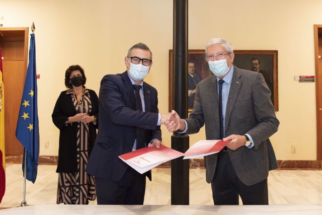 La Universidad de Murcia y la Asociación Española Contra el Cáncer (AECC) han firmado este martes un convenio de colaboración que permitirá que estudiantes de la institución realicen actividades de voluntariado para colaborar con la asociación. El rector de la UMU, José Luján, y el presidente de la Asociación Española Contra el Cáncer en la Región, Manuel Molina Boix.