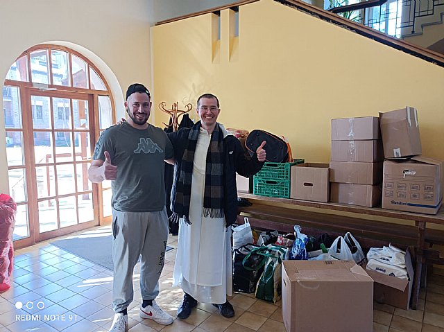 Y así, sin descanso alguno pero con el tesón que le caracteriza partió rumbo a Polonia tras salir de su jornada de trabajo junto a Rubén Soriano Carrillo, también murciano para llevar la furgoneta y el remolque cargado de ayuda humanitaria y recoger a doce refugiados para traerlos a Suiza. Su primera parada fue en el monasterio de los dominicos donde el padre Maciej los recibió con comida y un lugar para descansar.