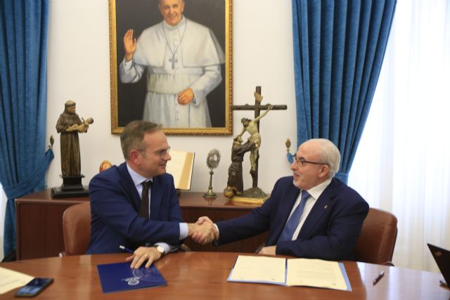 Los presidentes de la Universidad Católica de Murcia y de la Federación de Asociaciones de Familias Católicas de Europa, José Luis Mendoza y Vincenzo Brassi, han firmado un convenio porel que se crea la Cátedra Europea de Políticas Públicas, Tributos y Familia que tiene comoobjetivo poner en valor el papel esencial que desempeña la familia en la sociedad.