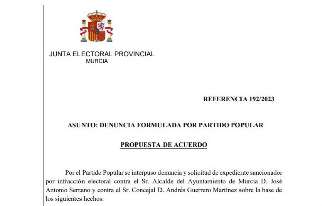 De igual manera, la Junta Electoral advierte a Serrano y Guerrero que les abrirá "un expediente sancionador por infracción electoral" en caso de que realicen nuevos anuncios similares al que realizaron hace días en Churra.