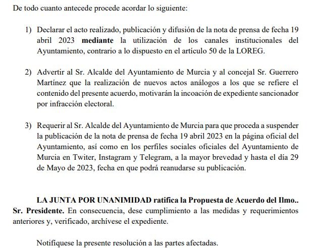 El fallo de la Junta Electoral obliga al alcalde socialista a que elimine de la página web del Ayuntamiento la nota de prensa que publicó por el acto que realizó en Churra y lo emplaza también a que suprima todas las publicaciones que realizó al respecto en los perfiles oficiales del Consistorio en las redes sociales