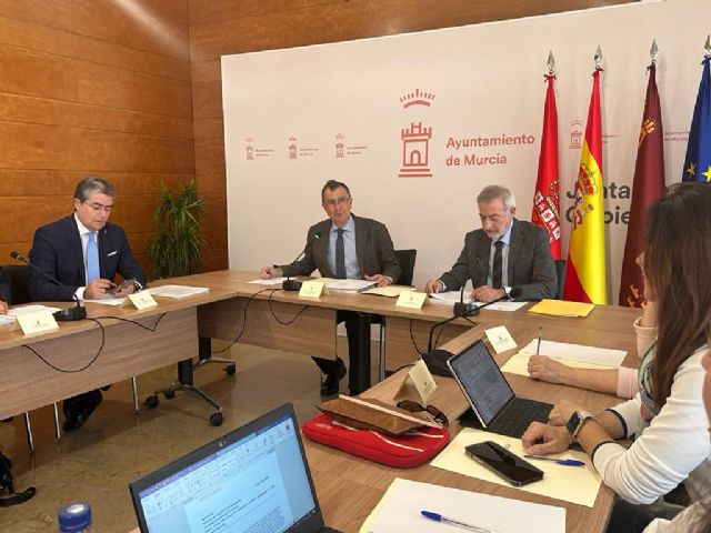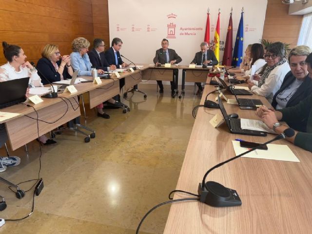 El alcalde de Murcia, José Ballesta, acompañado por la concejal de Gobierno Abierto, Promoción Económica y Empleo, Mercedes Bernabé, el concejal de Turismo, Comercio y Consumo, Jesús Pacheco, la concejal de Bienestar Social, Familia y Salud, Pilar Torres, y la vicepresidenta primera de Mercamurcia, Mayte Castillo, ha presidido esta mañana el Consejo de Administración de Mercamurcia.