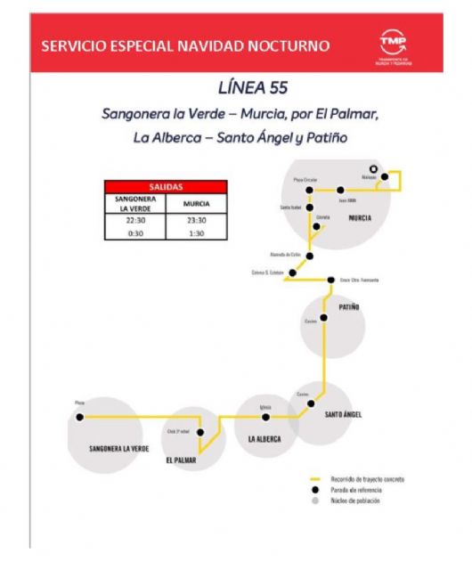 Las pedanías de Murcia tendrán un nuevo servicio nocturno de autobús los fines de semana de Navidad sin coste para los usuarios. El Servicio Municipal de Transportes, dependiente de la Concejalía de Movilidad, que dirige el edil José Francisco Muñoz, ha planificado, coordinado y diseñado, junto a la empresa concesionaria, 6 líneas, distintas a las regulares, que comenzarán a operar mañana viernes, con salidas a las 22:30 horas desde Sangonera la Verde, Zeneta, Rincón de Beniscornia, Sangonera la Seca, Alquerías y Cobatillas.