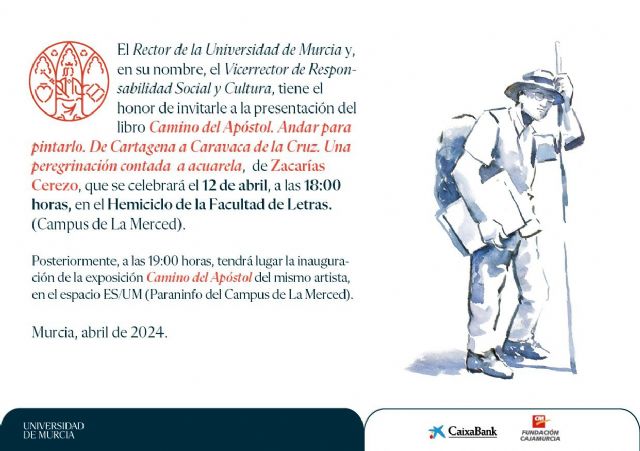 La Universidad de Murcia acoge este viernes, 12 de abril, a las 18.00 horas, en el Hemiciclo de la Facultad de Letras, la presentación del libro de Zacarías Cerezo 'Camino del Apóstol. Andar para Pintarlo. Desde Cartagena a Caravaca de la Cruz. Una peregrinación contada a acuarela.' Tras la presentación del libro tendrá lugar la inauguración de la exposición 'Camino del Apóstol' del mismo artista en el espacio ES/UM, en el Paraninfo del Campus de la Merced.