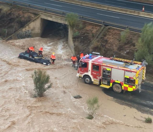 A las 18:56 horas, el 1-1-2 recibió una llamada solicitando asistencia para una mujer que había sido arrastrada por la corriente y su vehículo quedó atascado en el barro mientras circulaba por la vía de servicio RM19, cerca de la salida de Sucina, en Murcia.