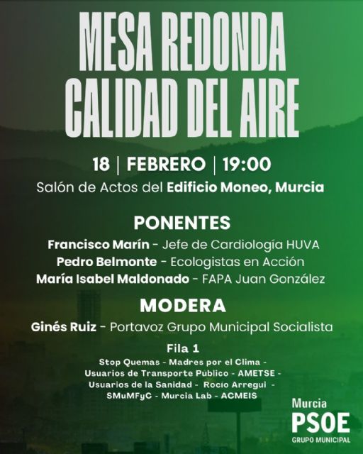 El Salón de Actos del Moneo del Ayuntamiento de Murcia acogerá el próximo martes, 18 de febrero, una mesa redonda, organizada por el Grupo Socialista, bajo el título"Contaminación y calidad del aire en Murcia: análisis, propuestas y soluciones". El evento, que tendrá lugar a las 19:00 horas, reunirá a expertos, representantes de la sociedad civil y colectivos sociales con el objetivo de abordar uno de los mayores desafíos medioambientales y de salud pública que enfrenta el municipio.