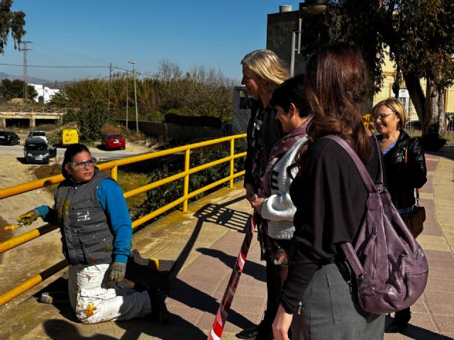 La concejal de Gobierno Abierto, Promoción Económica y Empleo, Mercedes Bernabé, ha visitado junto a la presidenta de la Junta Municipal de Torreagüera, Silvia Almarcha, los trabajos que han ejecutado en la barandilla perimetral del Paseo Las Palmeras de la pedanía los alumnos del Programa Mixto de Empleo y Formación de Mayores ‘Mantenimiento de Edificios'.