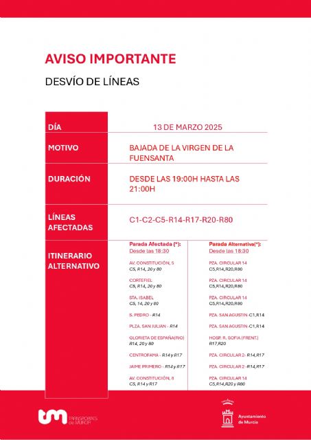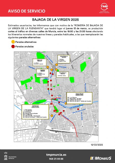 A partir de las 18:00, una vez que la romería entre en la ciudad, se habilitarán paradas alternativas en las líneas de pedanías, anulándose temporalmente las existentes en Avenida de la Constitución, Gran Vía, Glorieta, Teniente Flomesta, Plaza Camachos, Alameda de Colón, Torre de Romo, Infante Juan Manuel 2 y Princesa, afectando a las líneas 1, 6, 26, 28, 29, 30, 31, 44, 50, 62.