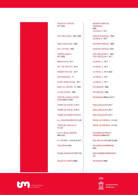 La de Plaza Circular, 14, se habilitar para quienes utilicen la línea 1 hacia San Ginés, la 31 hacia Los Rectores o la 50 hacia Cabezo de Torres, mientras que la de Plaza Circular, 2, servirá como parada de la línea 26 que conecta con El Palmar y La Arrixaca.
