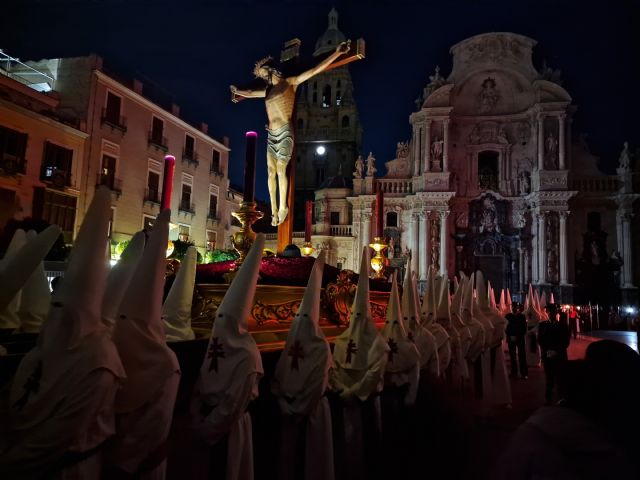 Uno de los momentos más conmovedores tuvo lugar en la Plaza Cardenal Belluga, donde el paso del Cristo de la Salud ante la fachada barroca de la Catedral de Murcia, bajo una atmósfera de recogimiento, silencio y luz tenue, invitó a la reflexión y a la oración. La noche primaveral acompañó esta escena de honda espiritualidad, vivida con intensidad por miles de asistentes.