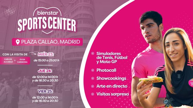El 'Bienstar Sport Center' acogerá una gran plataforma gaming e interactiva, con muchos contenidos y actividades, y muchas sorpresas y regalos para los asistentes. El stand estará diferenciado por cuatro zonas, tanto en la parte delantera como trasera, que contará con un simulador de Moto GP y una zona photocall tematizada con fotomatón para que los usuarios puedan grabar contenido y compartirlo en sus redes sociales. Además, se desarrollará un torneo virtual de tenis 'pong', que permitirá competir con el avatar de Carlos Alcaraz, y un torneo subsoccer para los amantes del fútbol.