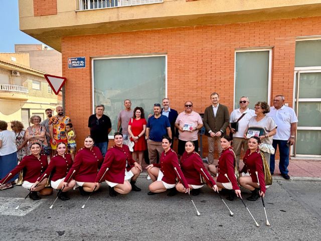 Joaquín Olmos, conocido como El Pescao porque regentaba una pescadería en la calle que lleva ahora su nombre, fue presidente de la Comisión de Fiestas de Los Ramos, además de uno de los impulsores de la Banda de Música de Cornetas, Tambores y Majoretes, entre otras muchas implicaciones en esta pedanía. En este acto de homenaje, que ha dado respuesta a una demanda de la Junta Municipal, no ha faltado por tanto ni la música ni la actuación de las majorettes.