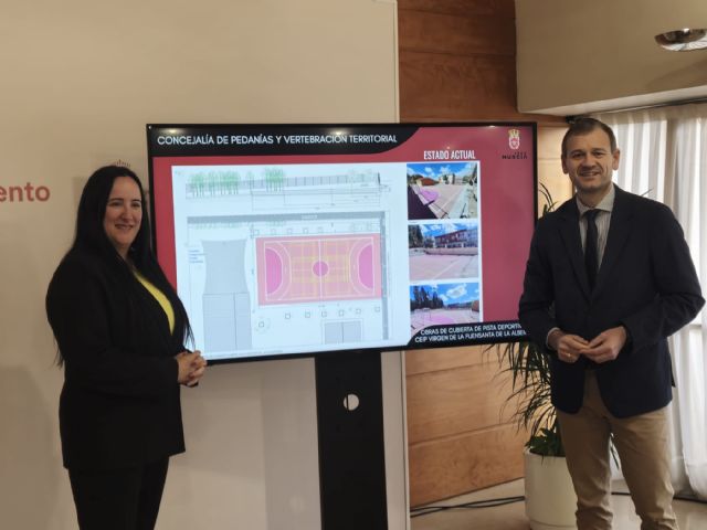 El CEIP Virgen de la Fuensanta de La Alberca contará con una nueva cubierta que protegerá la pista polideportiva del patio tanto del sol como de otras inclemencias climatológicas, a los cerca de 300 alumnos de este centro educativo y otros usuarios de este espacio. El concejal de Pedanías y Vertebración Territorial, Marco Antonio Fernández, acompañado de la presidenta de la Junta Municipal de La Alberca, Carolina Pardo, ha anunciado la aprobación en Junta de Gobierno del expediente para su contratación, por un importe de 216.162 euros.
