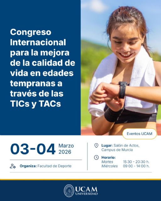 La Universidad Católica San Antonio de Murcia (UCAM) celebrará los días 3 y 4 de marzo el Congreso internacional para la mejora de la calidad de vida en edades tempranas a través de las TIC y las TAC, un foro científico que reunirá a especialistas nacionales e internacionales en el ámbito de la tecnología aplicada a la educación y al bienestar infantil y juvenil. Su objetivo es difundir el conocimiento científico más reciente sobre la mejora de la calidad de vida en edades tempranas mediante el uso de las Tecnologías de la Información y la Comunicación (TIC) y las Tecnologías del Aprendizaje y el Conocimiento (TAC).