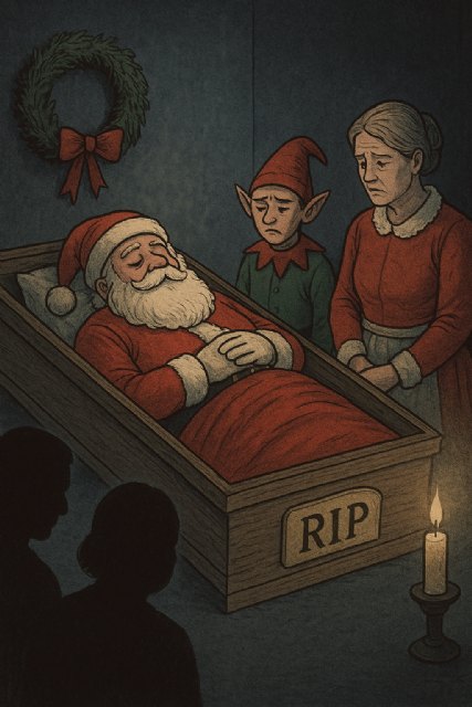 "Santa Claus ha muerto. Nuestro más sincero pésame a los elfos y a la señora Claus. No vamos a entrar en detalles, pero estos últimos años han sido muy decepcionantes para Santa y decidió no dejar sucesor. Los almacenes se han cerrado para siempre. Adiós, Santa".
