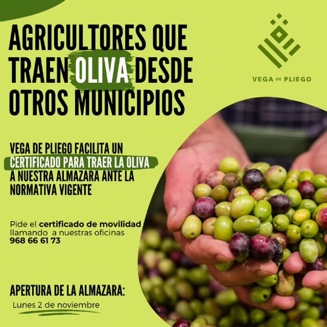 El presidente de Vega de Pliego, Pedro Noguera, ha remarcado que "son cientos los agricultores que vienen desde numerosos municipios de la Región, así como de Alicante y Almería a traernos su cosecha de oliva, conocedores de la excelente calidad del aceite que producimos. Por ello ponemos a su disposición este certificado, ya que la cosecha no se puede retrasar y esperamos recibir grandes cantidades de oliva, las cuales serán recepcionadas en nuestra almazara a partir del lunes con todo tipo de medidas de prevención para garantizar que esta actividad se produce de forma segura y sin riesgo de contagios".