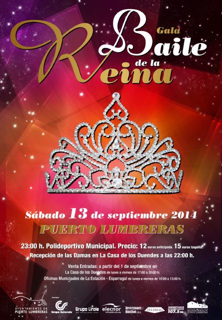 El Ayuntamiento de Puerto Lumbreras pone a la venta mañana lunes 1 de septiembre las entradas para la edición 2014 del tradicional 'Baile de la Reina'. Concretamente, las entradas se podrán adquirir en la Casa de los Duendes de lunes a viernes en horario de 17.00 a 20.00 horas, y en las Oficinas Municipales de La Estación-Esparragal de 10.00 a 13.00h. Así, este año se ha mantenido el precio habitual de las entradas que cuestan 12 euros anticipadas y 15 euros en taquilla.