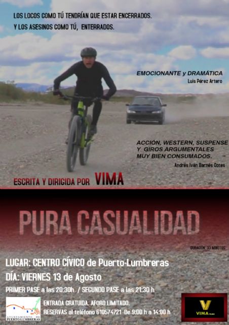 El Centro Cívico Cultural de Puerto Lumbreras albergará el próximo viernes 13 de agosto el estreno del cortometraje "Pura casualidad", escrito, dirigido, producido y protagonizado por el lumbrerense Víctor López Parra; "Vima", y con una duración de 33 minutos. Una proyección que se llevará a cabo en dos pases (20.30 y 21.30 horas), con aforo limitado y entrada gratuita. Las reservas pueden realizarse llamando al teléfono 610 574 721 de lunes a viernes de 09.00 a 14.00 horas.