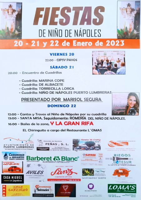 "Desde este viernes, 20 de enero, y hasta el domingo, 22 de enero, podremos disfrutar de diferentes actividades y actuaciones con motivo de esta celebración en la pedanía lumbrerense. Tres días intensos para celebrar estas fiestas en honor al Niño de Nápoles que se realizan cada año en la Ermita ubicada en la zona de 'El Descanso' de Puerto Lumbreras", ha explicado el edil.