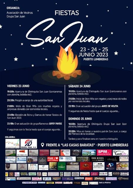 La Asociación de Vecinos 'Grupo San Juan', en colaboración conel Ayuntamiento de Puerto Lumbreras, celebrará a partir del viernes, 23 de junio, y hasta el domingo 25 de junio, las fiestas en honor a su Patrón.