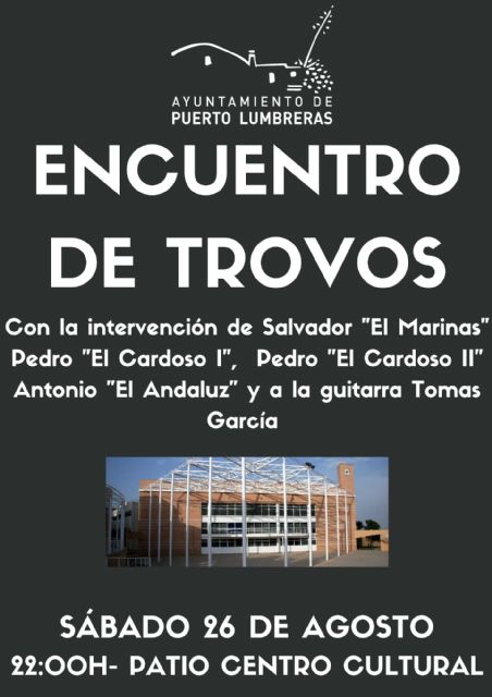 "Continuamos con la puesta en marcha de diferentes actividades durante la época estival con el que será el último evento de este 2023. El patio del Centro Cívico Cultural acogerá el sábado 26 de agosto el tradicional encuentro de trovos de Puerto Lumbreras", ha informado la edil.
