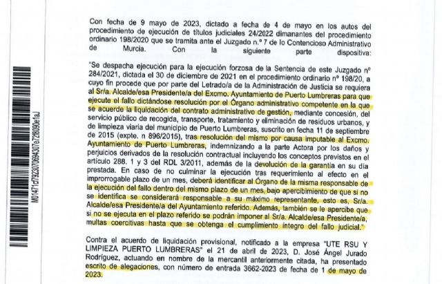 La portavoz del PSOE en el ayuntamiento de Puerto Lumbreras, María Rosa García, ha señalado que "nuevamente se pone de manifiesto la pésima gestión llevada a cabo por el equipo de gobierno, el desprecio a las empresas que prestan servicio en nuestro municipio y la lamentable imagen que se proyecta de una alcaldesa a la que le podrían imponer multas como presidenta del ayuntamiento por el incumplimiento de una sentencia. Esta situación pone en entredicho su capacidad para la resolución de los problemas que nos afectan como consecuencia de su mala gestión¨.