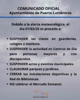 "Asimismo, se suspenden todos los actos y eventos municipales y actividades al aire libre que se iban a desarrollar mañana en el municipio. No se celebrará el Mercado Semanal de Puerto Lumbreras y se procede al cierre de todas las instalaciones deportivas municipales: polideportivo, piscina, Red de Bibliotecas y parques y jardines".