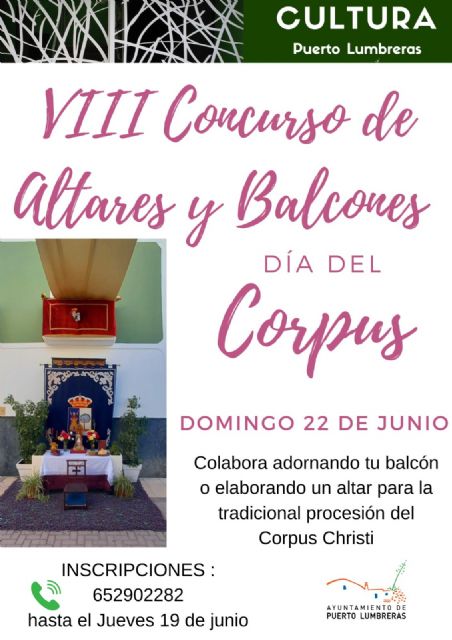 La concejal de Cultura del Ayuntamiento de Puerto Lumbreras, Toñi Navarro, ha informado de la celebración de la octava edición del Concurso de Altares y Balcones con motivo del Corpus Christi.