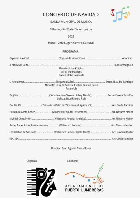La concejal de Cultura del Ayuntamiento de Puerto Lumbreras, Toñi Navarro, ha informado de la celebración del Concierto de Navidad de la Banda Municipal de Música.