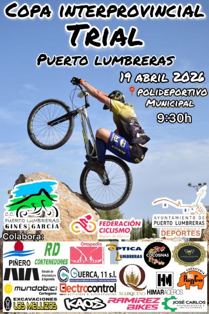 Túnez ha explicado que "el domingo, 19 de abril, Puerto Lumbreras volverá a ser sede deportiva de la modalidad de trial con la celebración de la Copa Interprovincial de Trial, organizada por la Federación de Ciclismo de la Región de Murcia en colaboración con el Ayuntamiento de Puerto Lumbreras y el Club Ciclista Puerto Lumbreras".