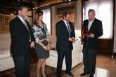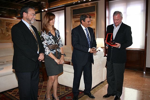 El jefe del Ejecutivo regional, Ramón Luis Valcárcel, recibió hoy al presidente de la Unión de Cooperativas de Murcia (UCOMUR), Juan Antonio Pedreño, junto a la vicepresidenta, Ana Sánchez, y a uno de los miembros del consejo rector, Juan Pablo Muñoz. Pedreño le hizo entrega al presidente de una réplica de la Medalla de Oro de la Región con la que el Gobierno murciano reconoció el pasado 9 de junio, Día de la Región, la labor realizada por UCOMUR en el progreso y desarrollo de la Comunidad Autónoma. De esta forma, UCOMUR ha querido hacer partícipe al presidente y a todo el Gobierno del apoyo mostrado al movimiento cooperativo. Además, Juan Antonio Pedreño informó a Valcárcel de los datos relativos a la creación de cooperativas en la Región durante este año.