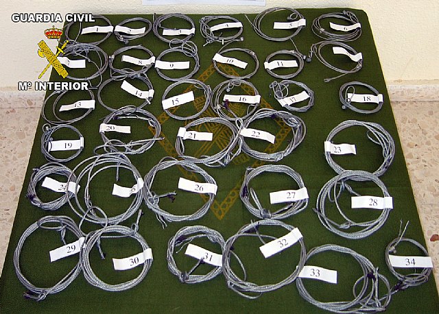 Agentes del Servicio de Protección de la Naturaleza (SEPRONA) de la Guardia Civil, en la denominada“OPERACIÓN LAZO” desarrollada durante las últimas semanas, han detenido a F.T.F., de 53 años de edad, y vecino de El Pilar de la Horadada (Alicante) y a J.A.L.C., de 37 años de edad, y vecino de San Javier (Murcia), como presuntos autores de un delito relativo a la protección de la fauna, por el empleo de artes de gran eficacia destructiva para la fauna en el interior de un coto privado de caza sito en el término municipal de Murcia, en concreto en el interior de la Zona Especial de Protección de Aves (ZEPA) denominada “Monte el Valle y Sierras de Altaona y Escalona”, donde hay censadas diversas poblaciones de especies protegidas, como el Búho real (“Bubo bubo”) y el Águila real (“Aquila chrysaetos”).
