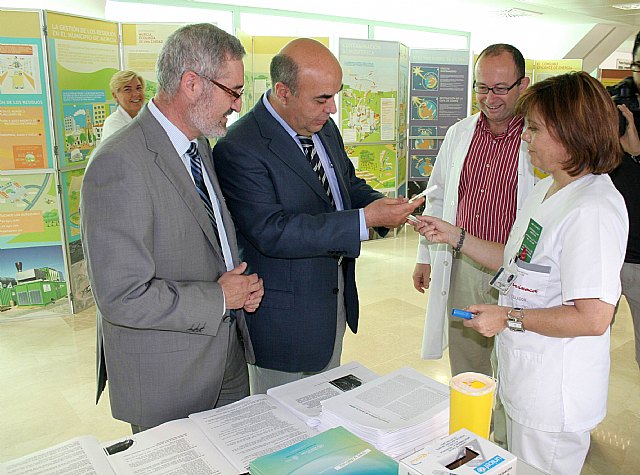 El director gerente del Servicio Murciano de Salud, José Antonio Alarcón, junto al director gerente del Área I Murcia Oeste, Manuel Alcaraz, visitó hoy una mesa que, bajo el lema ‘Cuida el medioambiente cuidando tu salud’, cambiará termómetros de mercurio por digitales, al tiempo que concienciará sobre el tabaquismo pasivo, realizará cooximetrías (medición de los niveles de monóxido de carbono) y determinará la edad pulmonar a fumadores y no fumadores. La Semana Verde coincide con la celebración del Día Mundial sin Tabaco el 31 de mayo y del Día Mundial del Medio Ambiente el 5 de junio.