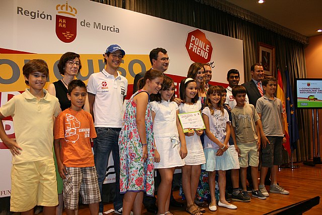 El consejero de Obras Públicas y Ordenación del Territorio, José Ballesta, acompañado del consejero de Educación, Formación y Empleo, Constantino Sotoca, la directora de la Fundación Antena 3, Carmen Bieger, y los dos pilotos de Fórmula Uno del equipo Hispania, Brunno Senna y Karun Chandhok, hizo entrega hoy de los premios del primer concurso de seguridad vial 'Ponle Freno Junior' a los niños de 4° y 5° de Primaria de los colegios Antonio de Nebrija (Cabezo de Torres, Murcia) y Ciudad del Sol (Lorca), que llevarán sus mensajes de seguridad vial a la televisión y la radio nacionales a través de Antena 3 Televisión y Onda Cero Radio.