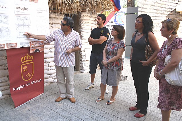 La directora gerente del Instituto de Vivienda y Suelo de la Región de Murcia, Juana Castaño, acompañada por el vicepresidente de la Organización No Gubernamental para el Desarrollo murciana Bomberos en Acción, César Claros, y la alcaldesa de Lorquí, Dolores García, visitaron hoy en la Plaza de Santo Domingo de Murcia el prototipo de refugio diseñado como hogar provisional para los damnificados del terremoto en Haití, cuya construcción se iniciará en septiembre con el apoyo de la Comunidad.